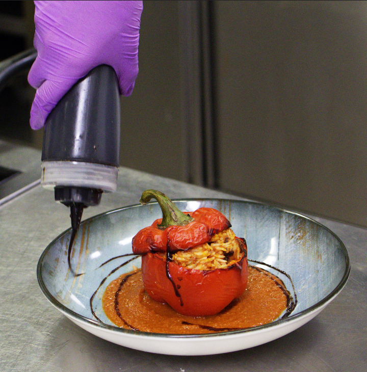 Paprika (vegan): Ofengebackene Paprika mit Reis auf würzigem Tomatenspiegel, verfeinert mit Balsamico.