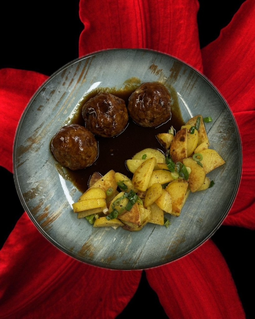 Fleischpflanzerl: Zarte Fleischbällchen in aromatischer Soße mit knusprigen Bratkartoffeln und Frühlingszwiebeln.